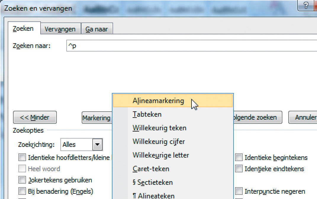 U kunt Word ook laten zoeken naar niet-afdrukbare tekens, denk hierbij aan tabs of een alineamarkering. U kunt de bijbehorende codes in het zoekveld handmatig invoeren - een tab wordt daar weergegeven door ^t en een alineamarkering door ^p. Makkelijker is wellicht om gewoon gebruik te maken van de knop Speciaal in het zoekvenster, daar kunt u behalve deze twee onzichtbare zaken ook nog een hele lijst soortgenoten kiezen. Hebt u bijvoorbeeld een tekst van een auteur die steeds weer twee keer op Enter heeft gedrukt aan het eind van elke alinea, dan hoeft u alleen maar naar ^p^p te zoeken en dit illustere tweetal vervolgens te laten vervangen door ^p.