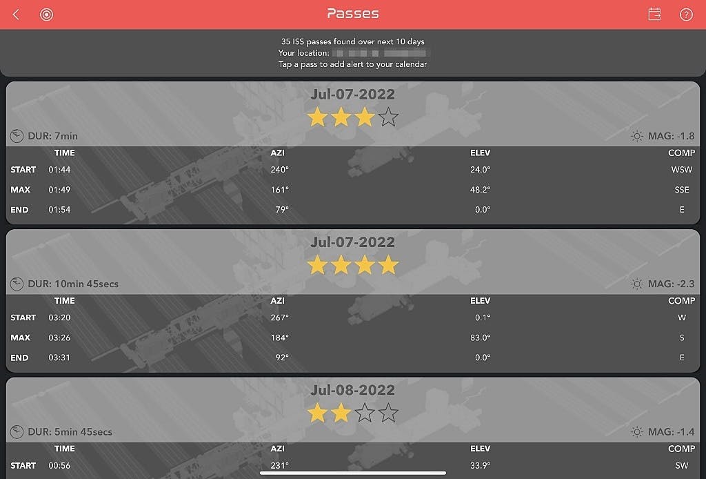 Wil je gewaarschuwd worden als het ISS zo ongeveer recht boven je hoofd passeert, tik dan op de derde knop op de knoppenbalk onderin beeld. Je ziet nu een lijst met voorspellingen (die altijd kloppen, voor de verandering). Desgewenst kun je die aan je agenda-app toevoegen, zodat je keurig op tijd een melding krijgt.