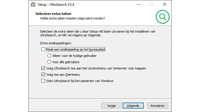 De site zal zelf de juiste versie voorstellen en dat zal meestal de 64bit-versie zijn. We voeren dit bestand uit om UltraSearch te installeren. De installatie kent geen bijzonderheden. Let op het vinkje bij Voeg UltraSearch toe …, dat staat standaard aan. Dankzij deze functie heb je straks altijd snel toegang tot deze zoekhulp via het contextmenu van Verkenner om binnen een specifieke map te zoeken (Zoeken met UltraSearch).