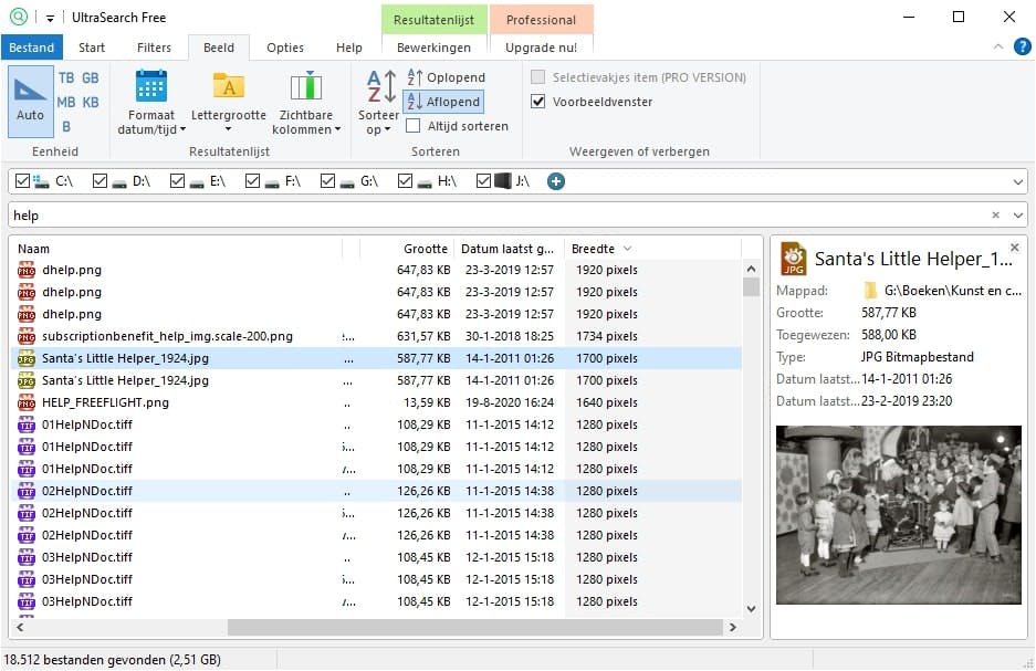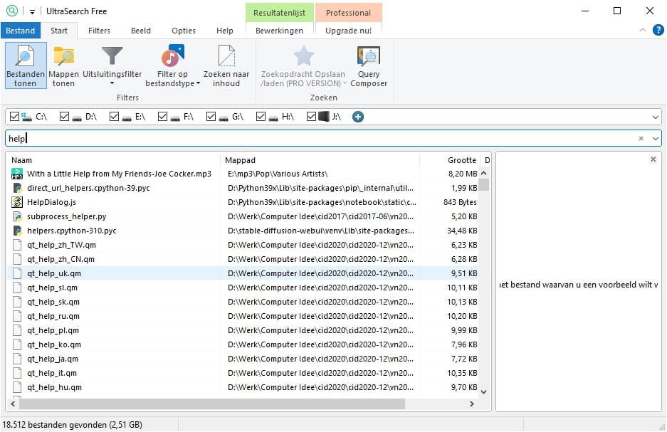 Zoals je merkt, begint het zoeken zodra je de eerste letter typt en is het resultaat razendsnel beschikbaar. Op ons testsysteem met zo’n 12 TB aan data vond UltraSearch ruim 18.000 bestanden met het woord ‘help’ ergens in de naam en dat binnen enkele seconden. Klik je in het tabblad Start op Mappen tonen, dan zoekt UltraSearch ook mappen die aan de zoekopdracht voldoen.