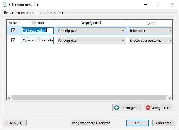 Klik je op Uitsluitingsfilter, dan zie je twee opties: Gebruik filter en Pas het filter aan. We hebben nog geen filter gemaakt, dus die laatste hebben we nodig. Zoals je ziet, zijn er standaard al twee items ingevuld. Hiermee slaat UltraSearch onder andere bestanden in de Prullenbak over bij zijn zoekacties.