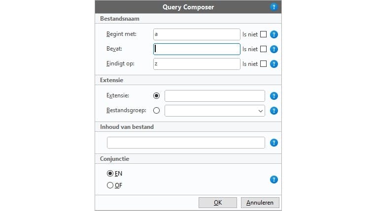 Je kunt deze criteria combineren met losse extensies en de hiervoor genoemde bestandsgroepen. Ook kun je kiezen of de resultaten moeten voldoen aan alle criteria (EN) of aan minstens één criterium (OF).