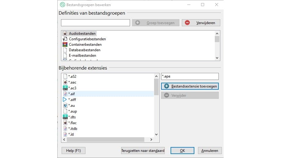 Om uit te vinden welke bestanden UltraSearch per categorie kent, klik je op Bestandstypen configureren. Daar zie je bijvoorbeeld bij Audiobestanden een lange lijst met extensies. Daar missen we echter het bestandstype .ape (het compressieformaat van de populaire audiobeheerder MediaMonkey). Dat is eenvoudig op te lossen: typ de extensie in het vak onder Bijbehorende extensies *.ape en klik op Bestandsextensie toevoegen.