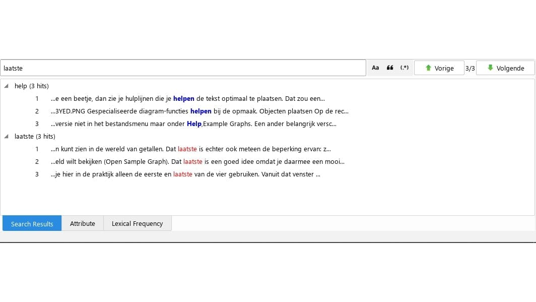 Ook zal het regelmatig voorkomen dat een woord meerdere keren voorkomt in een tekst. Je kunt dan op elk gevonden exemplaar dubbelklikken in de zoekboom om het in de context te zien. Ook voor een tweede zoekterm maakt Anytxt zo’n zoekboom.