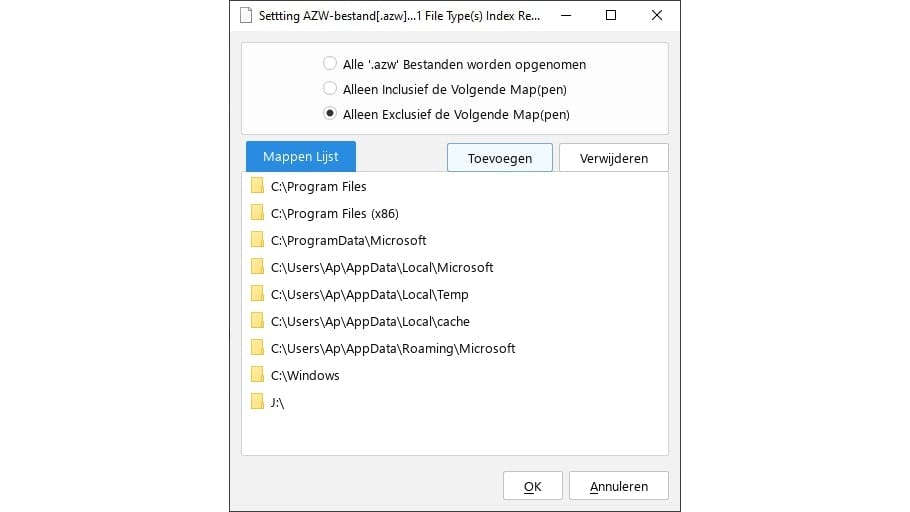 Standaard sluit Anytxt een aantal systeemmappen uit (alleen Exclusief). Via Toevoegen kun je deze lijst uitbreiden, bijvoorbeeld om een back-upschijf uit te sluiten. Je kunt ook kiezen voor alleen Inclusief om juist uitsluitend opgegeven mappen te indexeren.