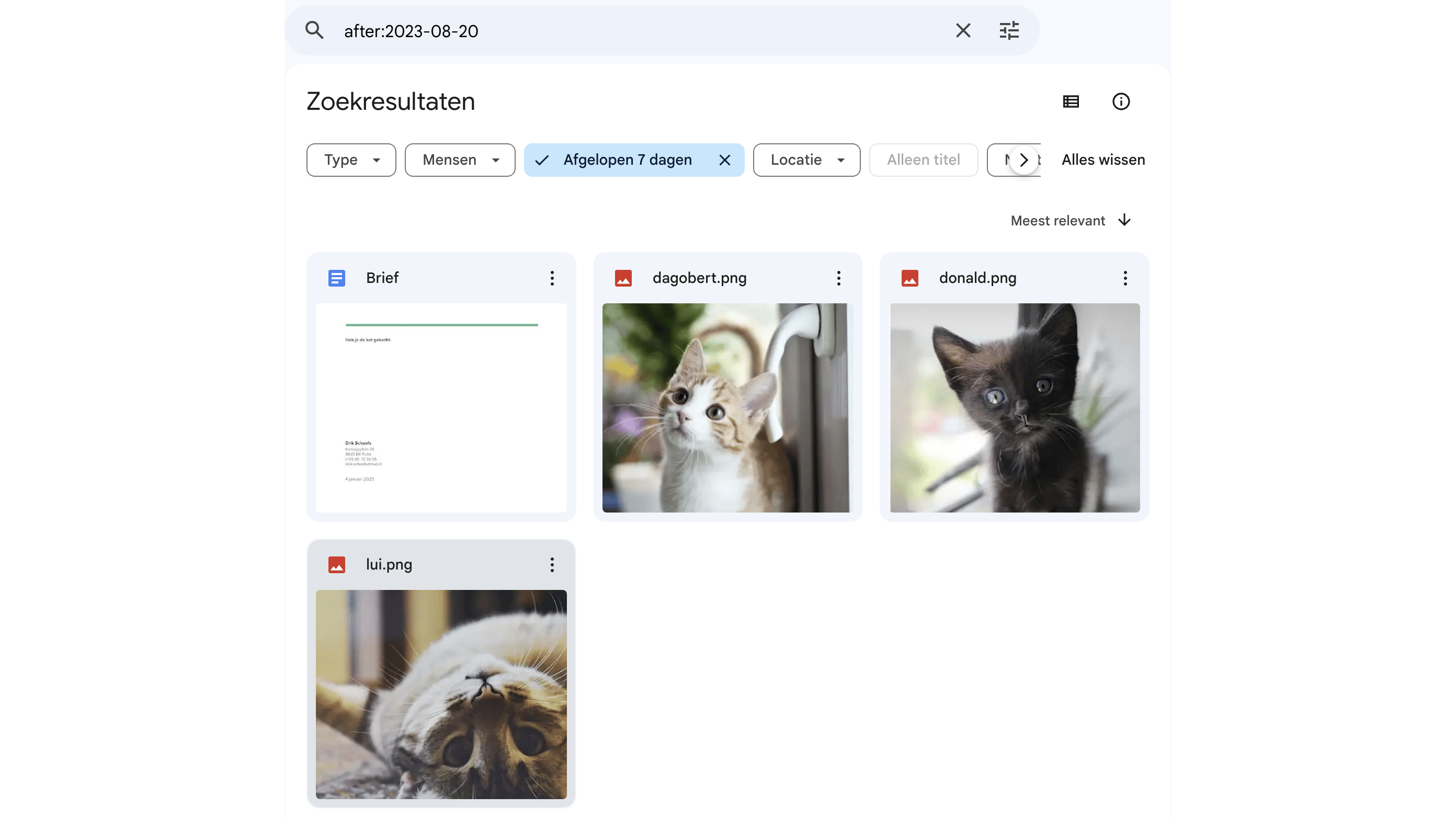 De zoekchips snuffelen ook in de inhoud van de bestanden. Veronderstel dat je een document of een pdf zoekt en je herinnert je dat een bepaalde term in het document voorkomt, dan typ je deze woorden in het vak Bevat de woorden. Je kunt ook op de bestandsnaam zoeken en daar is Google erg slim in. Als je bijvoorbeeld bij Naam van item het woord ‘kat’ typt, dan vindt Google niet alleen de bestanden met ‘kat’ in de naam, maar ook alle afbeeldingen waarop een poes staat. Als je het datumbereik kent waarbinnen het bestand is gewijzigd, dan kun je de zoekopdracht verfijnen op datum. Voor alle duidelijkheid, dit is de datum waarop het bestand voor het laatst is gewijzigd, niet de datum waarop het is aangemaakt.