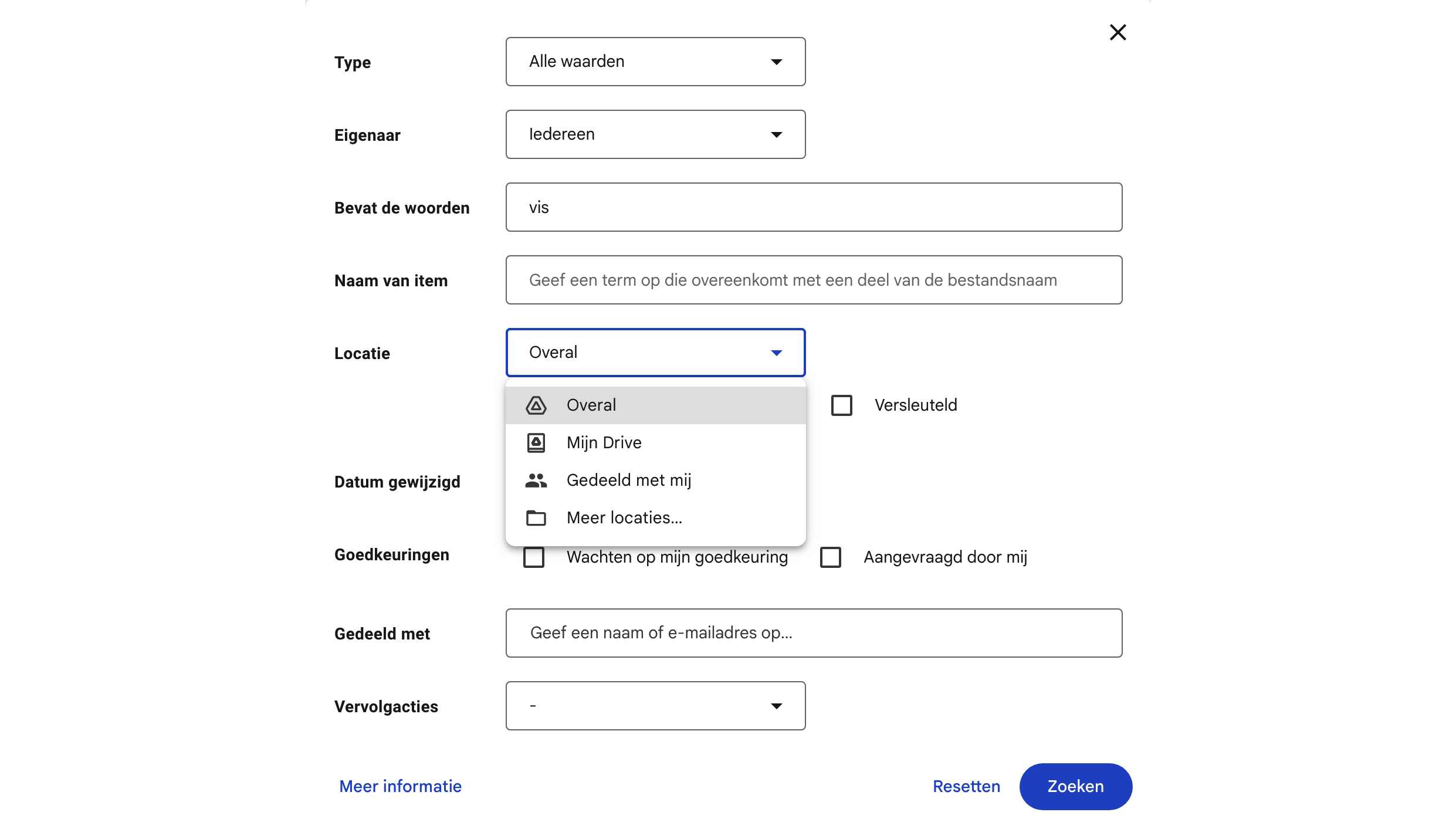 Om de geavanceerde zoekfunctie van Google Drive te openen, klik je op het pictogram met de schuifregelaars rechts in het zoekvak. In het eerste veld maak je een keuze uit het type bestand dat je zoekt. Gaat het om een foto of afbeelding, een pdf, een document, een spreadsheet, een formulier, audio, video of een zip-archief? Dat is al een goed begin, want meestal herinner je je het bestandstype wel dat je zoekt. Daarna geef je aan of het een bestand betreft waarvan jij de eigenaar bent. Of zoek je een bestand dat iemand anders met jou heeft gedeeld? Als je de persoon kent die dit bestand met jou heeft gedeeld, dan kun je diens naam hier ingeven.