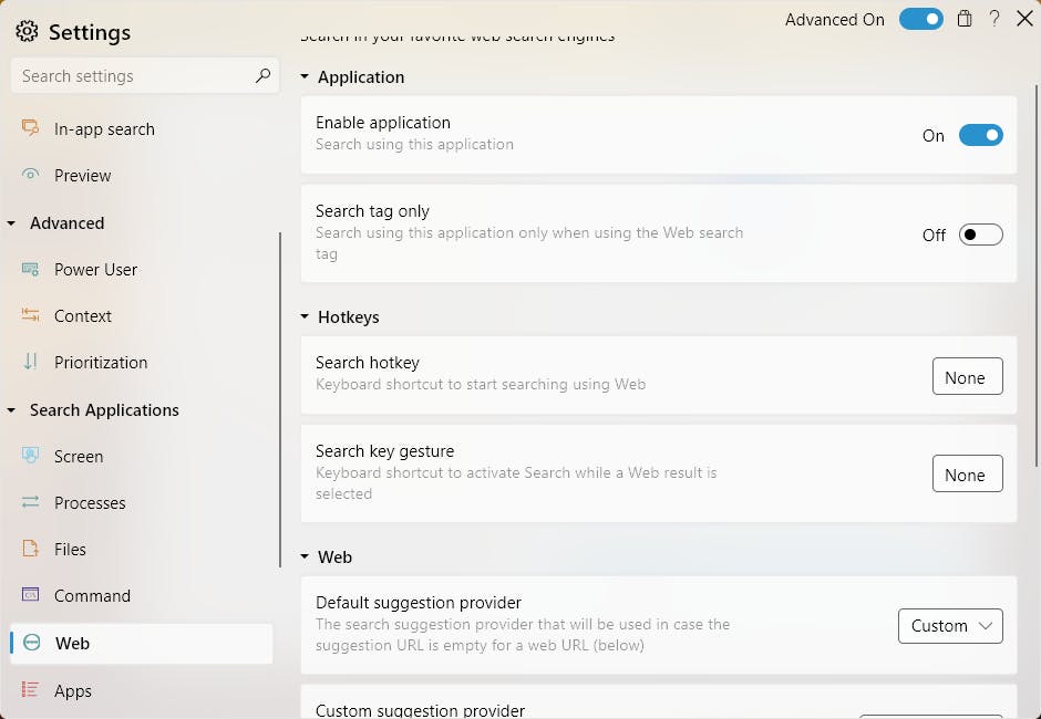 Je hoeft je zoektocht trouwens niet tot je lokale opslagruimte te beperken. Het volstaat Bing of Google in te tikken, gevolgd door TAB en je zoekterm. Liever een andere zoekmachine? Klik dan op het tandwielpictogram, ga naar Web, selecteer Custom bij Default suggestion provider en vul eronder de zoek-url in. Laat het zeker niet na om ook de overige instellingen te bestuderen.