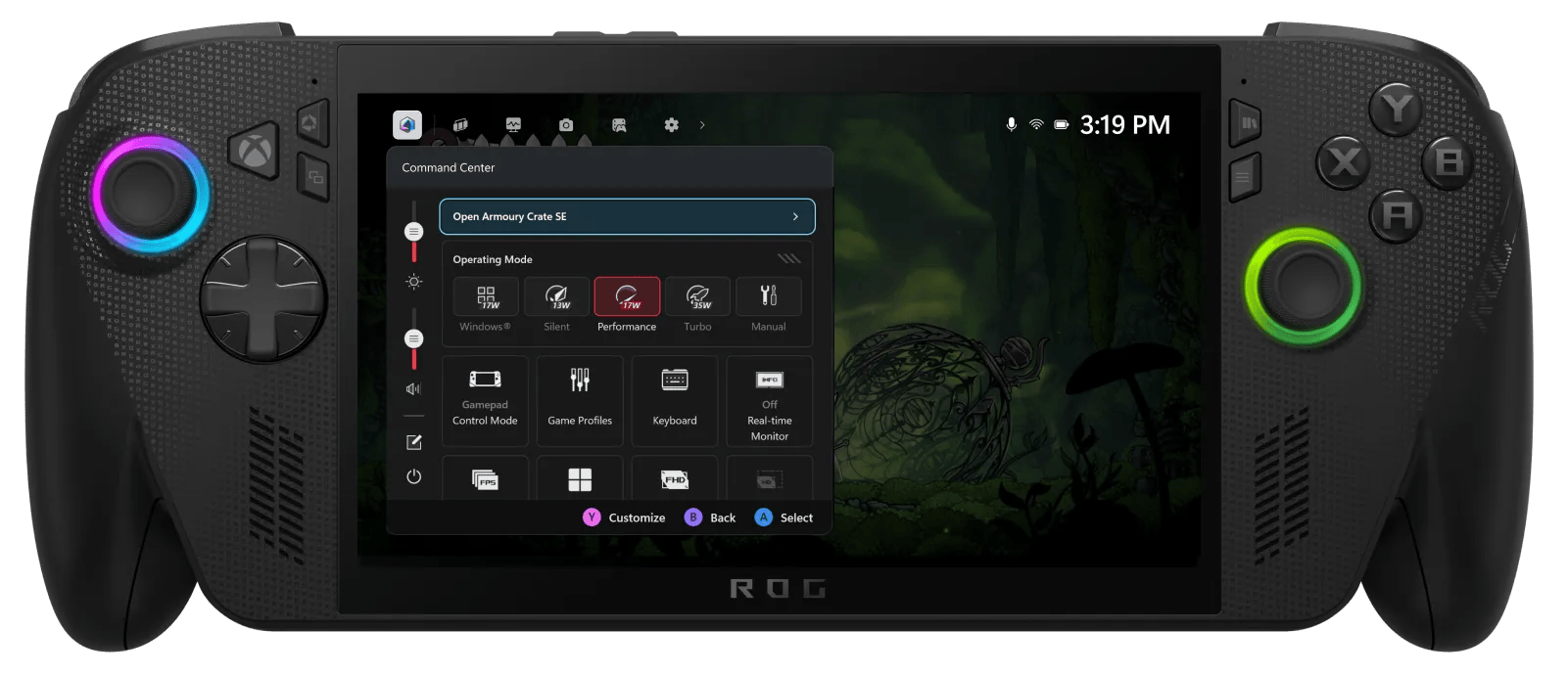 Zowel de Ally als de Ally X hebben een 7-inch Full-HD-scherm met 120 Hz verversingssnelheid, 500 nits helderheid en FreeSync Premium voor vloeiende beelden. Het scherm is beschermd met Gorilla Glass. De Ally X onderscheidt zich met dual Smart-Amp speakers, vibrerende triggers en subtiele RGB-verlichting rond de sticks voor extra feedback. Ook ergonomie kreeg de nodige aandacht: de vorm van de grepen is geïnspireerd op de Xbox-controller, met een gebalanceerd gewicht zodat langere speelsessies comfortabel blijven.