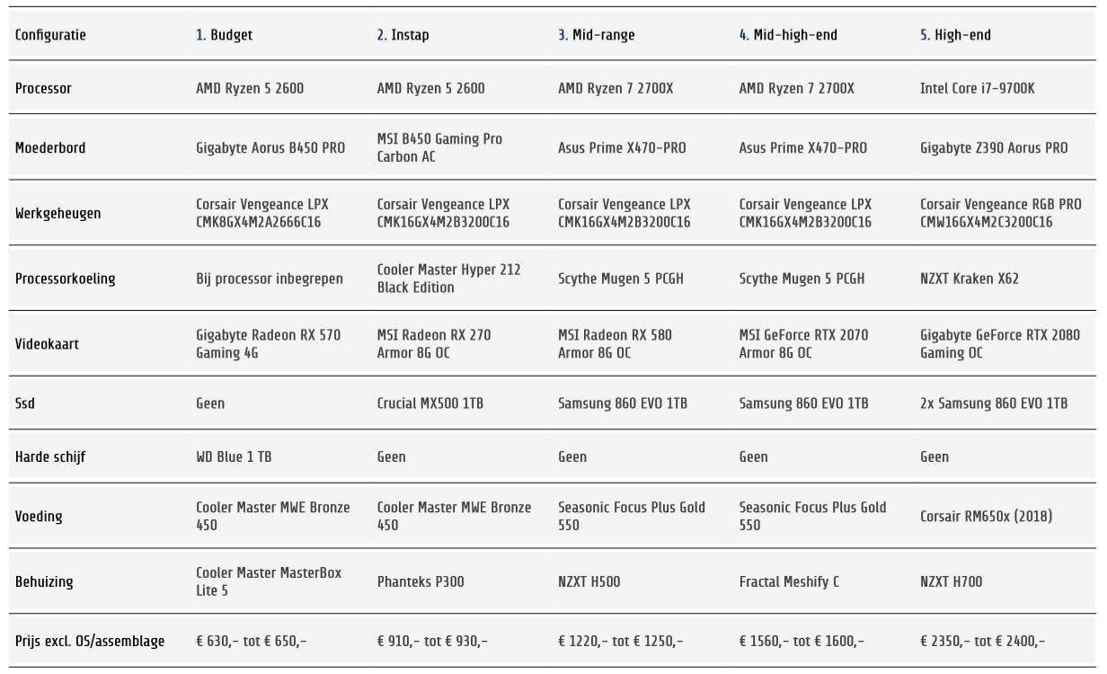 Hieronder vind je in één oogopslag vijf soorten configuraties. Onder de afbeelding gaan we per component dieper op ieder systeem in. Denk uiteraard aan het soort videokaart, maar ook zaken als opslag, voeding en de behuizing komen aan bod.