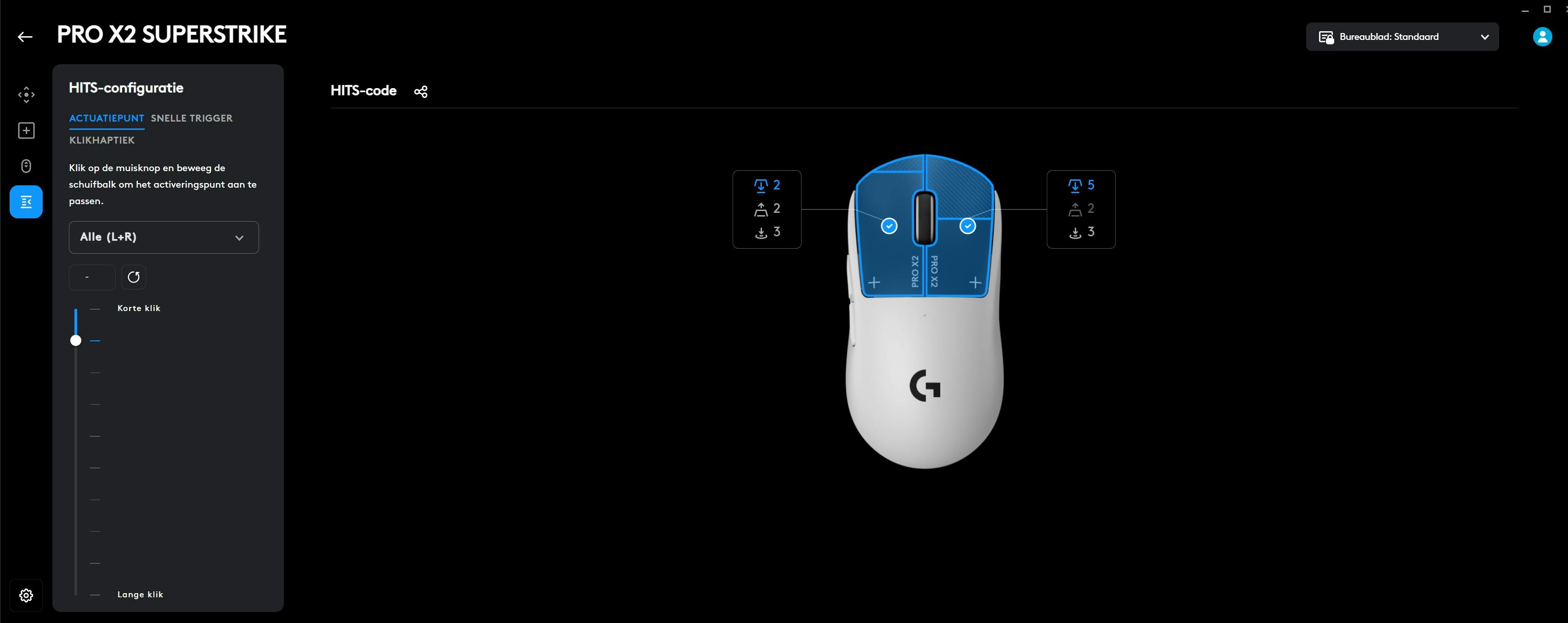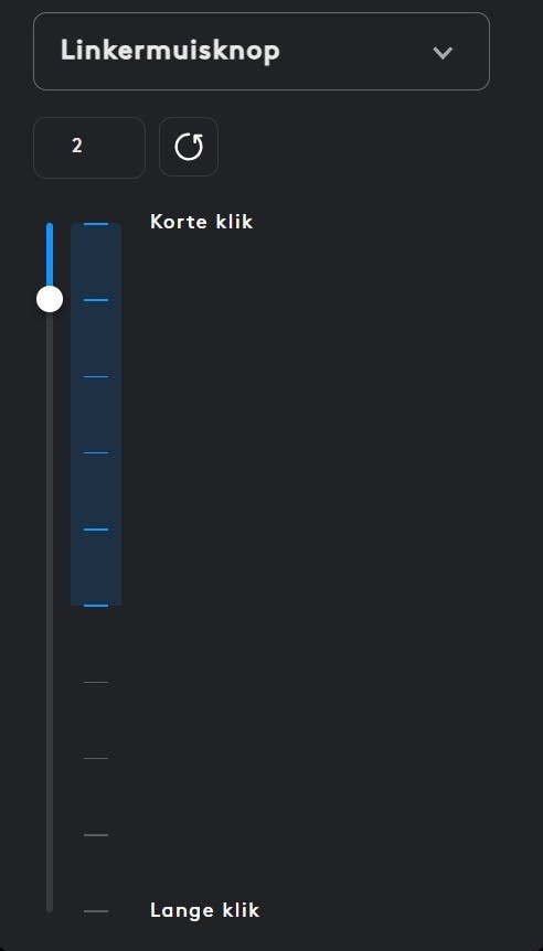 Daarvoor moet je wel even in de GHUB-software duiken, Logitechs programma voor game-accessoires. De instellingen voor de X2 Superstrike zijn daarbij verrassend simpel en goed gevisualiseerd. Je hebt de beschikking over tien registratiepunten en vijf resetpunten: allemaal van invloed op hoe snel respectievelijk een klik en een ‘uitklik’ worden geregistreerd. Hoe hoger je registratieniveau, hoe langer je vinger en knop moeten bewegen voordat een klik wordt geregistreerd.