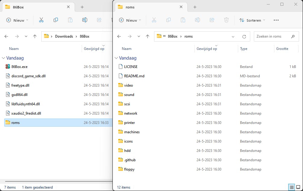Je vindt de benodigde images op deze locatie. Klik aan de rechterkant op Latest en vervolgens op Source code (zip). Maak een submap met de (verplichte) naam roms aan in de map waarin je 86Box hebt uitgepakt, bijvoorbeeld c:\86box\roms. Plaats de complete inhoud van het zojuist gedownloade zip-bestand roms-3.11.zip uit naar deze submap. Dit kan even duren, aangezien ongeveer 380 submappen en 840 bestanden moeten worden uitgepakt. Elk apparaattype uit deze ROM-set belandt namelijk in een afzonderlijke map, met ook weer aparte submappen voor de diverse apparaatmodellen of categorieën.