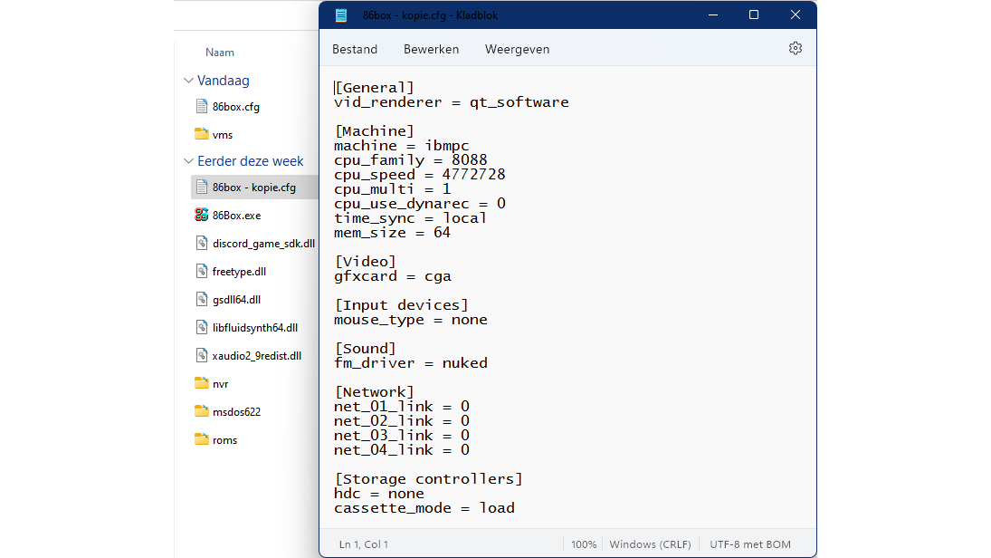 Wanneer je 86box.exe start, verschijnt er een programmavenster waarin even later een heuse IBM Personal Computer lijkt op te starten. Onderliggend zie je dat er in de map 86box een configuratiebestand is aangemaakt met de standaardnaam 86box.cfg. Als je dit bestand opent in een teksteditor zoals Kladblok, zie je meteen een reeks eigenschappen van de geëmuleerde machine, zoals 8088, CGA enzovoort. Dit zijn slechts minimale instellingen met weinig snelheid.