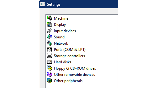 Om een nieuwe machine te creëren in 86Box, ga je naar Tools / Settings. Er wordt dan een nieuw dialoogvenster geopend met elf hardware-onderdelen die je indien gewenst kunt emuleren, waaronder Machine, Display, Input devices, Sound, Network en Hard disks. Hier kun je de benodigde onderdelen op de juiste manier instellen. We zullen alleen vermelden wat we zelf hebben gewijzigd. De overige items kun je in principe ongewijzigd laten, tenzij je specifieke parameters bewust wilt aanpassen. Dit kun je doen door op de knop Configure naast het betreffende item te klikken.