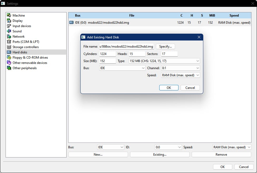 Bij de categorie Hard disks moet je opletten. Klik onderaan op de knop New en stel het Type in op 152 MB (CHS:1224, 15, 17), zodat de bijbehorende waardes automatisch worden ingevuld bij Cylinders (1224), Heads (15) en Sectors (17). Druk nu op de knop Specify en verwijs bijvoorbeeld naar het bestand msdos622hdd.img, ergens in je 86Box-map. Bevestig de wijzigingen met Opslaan en OK (2x). Het schijfbestand van ongeveer 152 MB wordt toegevoegd.