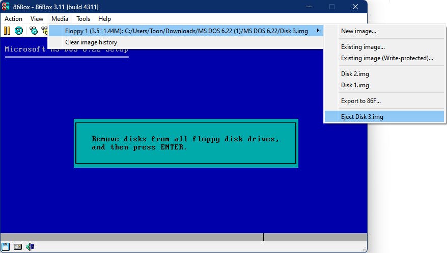 Na afloop maak je de koppeling ongedaan via Media / Floppy 1 / Eject Disk 3 Image en herstart je machine met Enter.