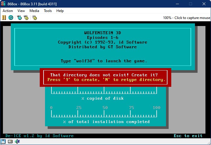 Voer nu het commando install.bat uit. Bij de vraag Which drive to install to tik je C in. De voorgestelde submap \Wolf3D voldoet prima. Druk op Y om deze te maken. Zodra om Disk 2 wordt gevraagd, koppel je het tweede img-bestand via het menu Media en bevestig je met Enter. Na afloop moet je nogmaals het eerste img-bestand koppelen. Vanuit de map C:\WOLF3D hoef je nu maar het commando wolf3d.exe uit te voeren en de pret kan beginnen. Vergeet na afloop je img-bestand niet te ontkoppelen.