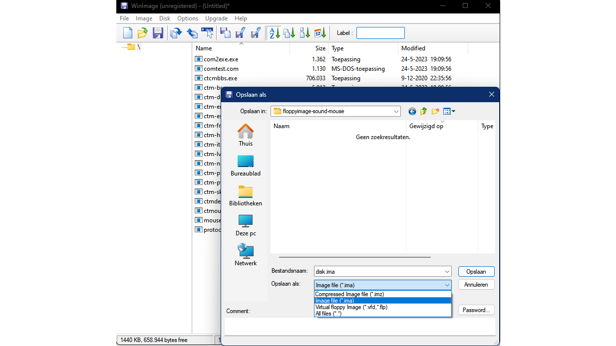 Het probleem is dat we de uitgepakte bestanden van de geluidskaart en de muis naar onze geëmuleerde machine moeten krijgen. Om dit te doen hebben we een floppy-imagebestand nodig en daarvoor maken we gebruik van WinImage (dertig dagen gratis beschikbaar). Installeer deze tool en start hem op als administrator. Open het menu File en kies New. Selecteer 1.44 MB bij Standard Format en bevestig met OK. Druk op het knopje Inject en selecteer het bestand ctcmbbs.exe van de Creative PnP Configuration Manager, evenals alle bestanden uit de submap \BIN van CuteMouse. Bevestig telkens met Yes. Druk op de knop Save, selecteer Image file (*.ima) bij Opslaan als en bewaar het bestand (bijvoorbeeld disk.ima). Sluit WinImage vervolgens af.