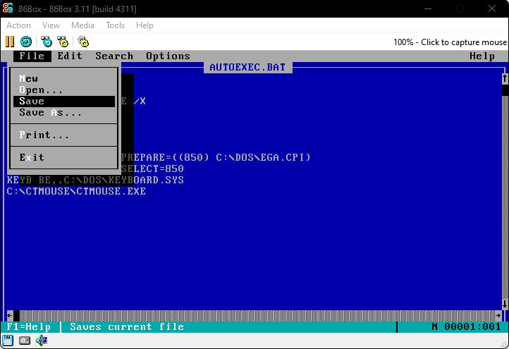 Dat besturingssysteem moet je dus eerst ophalen. Je vindt een versie van MS-DOS 6.22 onder meer op deze pagina, in de vorm van een zip-bestand. Uitgepakt levert dit drie genummerde img-bestanden op. Deze drie floppybestanden moet je in de juiste volgorde koppelen aan het geëmuleerde diskettestation in 86Box. Open hiervoor het menu Media en kies Floppy 1 (3.5" 1.44M): empty en kies Existing image. Verwijs naar het zojuist uitgepakte bestand Disk 1.img en bevestig met Enter, waarna de machine MS-DOS zal opstarten van deze virtuele floppydisk. Druk in het blauwe setupvenster op Enter, selecteer Configure allocated disk space (recommended) en druk tweemaal op Enter. Na de herstart wordt de virtuele harde schijf geformatteerd. Direct erna kun je het juiste land en toetsenbordlay-out instellen. Bevestig weer met Enter en stel de map in voor de MS-DOS-installatiebestanden (de standaardlocatie C:\Dos voldoet prima). Druk nogmaals op Enter, zodat de eigenlijke installatie kan starten. Wanneer om de volgende setupdisk wordt gevraagd, koppel je het tweede img-bestand aan de floppydrive, en je herhaalt dit voor het derde en laatste bestand.