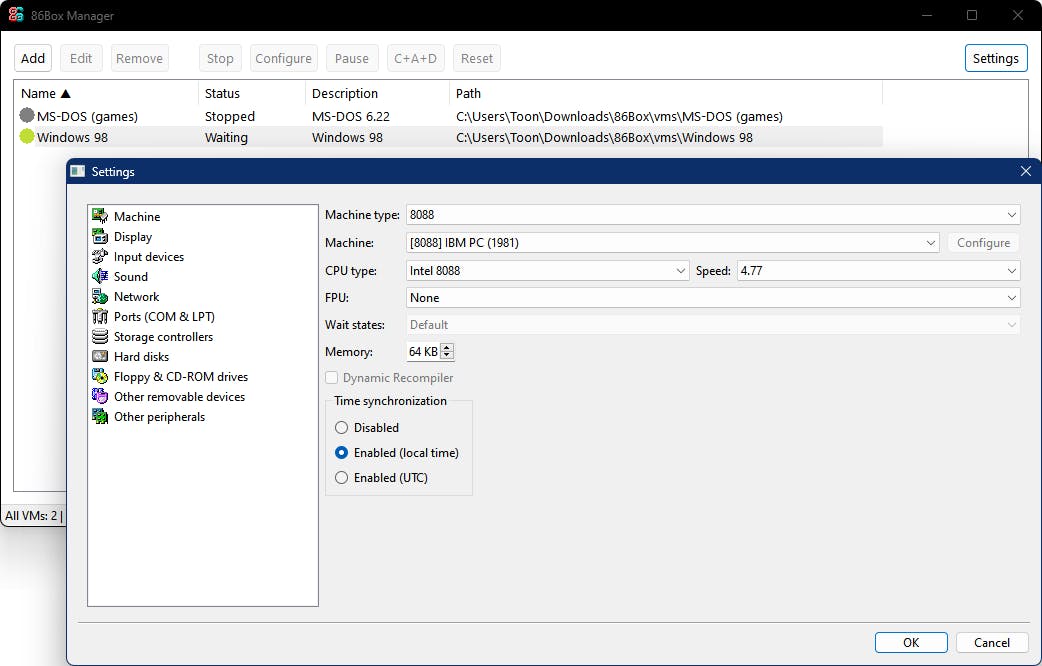 Klik op Latest om het zip-bestand te downloaden. Pak het zip-bestand uit naar een geschikte map. Zorg ervoor dat 86Box is afgesloten en start het bestand 86Manager.exe op vanuit deze map. Klik op de Settings-knop en gebruik de bovenste Browse-knop om naar de map te verwijzen waarin het bestand 86Box.exe staat. Gebruik de onderste Browse-knop om naar de map te verwijzen waarin de images (virtuele machines) moeten worden opgeslagen, bijvoorbeeld de submap \vms in je 86Box-map. Bevestig de wijzigingen met OK.