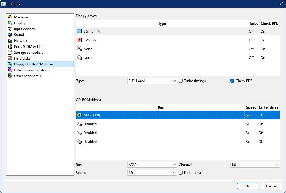 Het zal je niet verbazen dat we straks een floppydrive nodig hebben voor de installatie van MS-DOS. Ga naar de categorie Floppy & CD-ROM drives en selecteer bij het bovenste type Floppy Drives het Type 3.5" 1.44M.