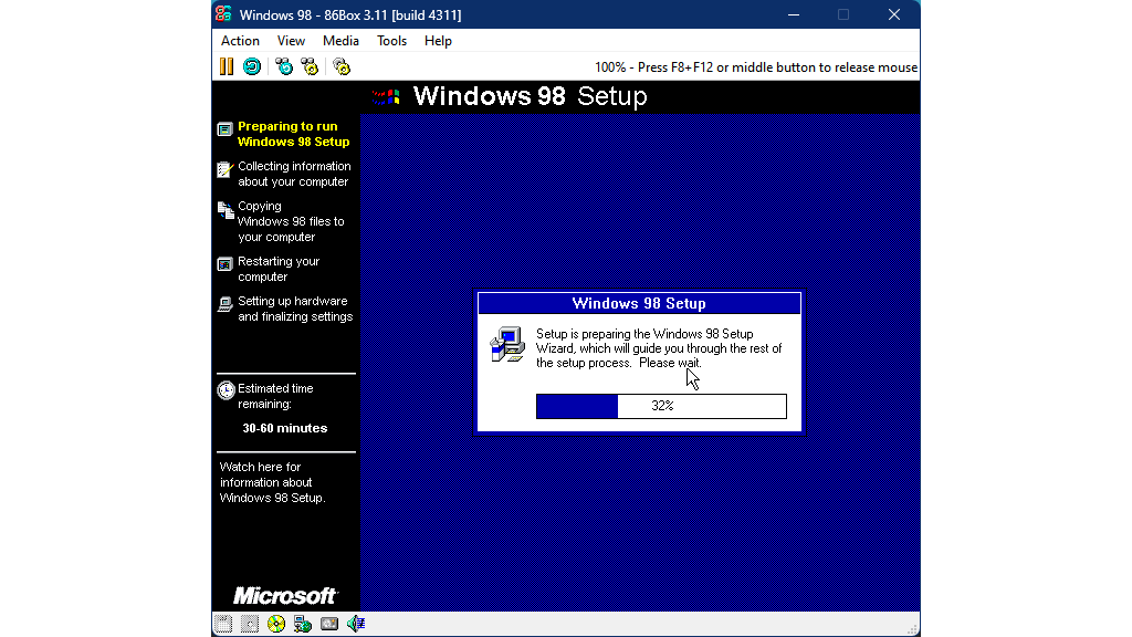Volg daarna de instructies van de Windows 98-installatiewizard. Houd er rekening mee dat dit proces ongeveer een halfuur kan duren. Na afloop heb je een werkende Windows 98-installatie. Een productsleutel vind je op de eerdergenoemde downloadpagina.