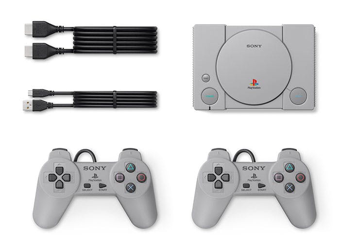 De PlayStation Classic wordt geleverd met twee controllers, overigens net zoals in de begintijden van de console zonder analoge sticks. Je sluit 'm aan via hdmi en micro-usb, waarvoor geen adapter wordt meegeleverd. Je kunt bijvoorbeeld de oplader van je telefoon ervoor gebruiken, of een usb-poort van je televisie.
