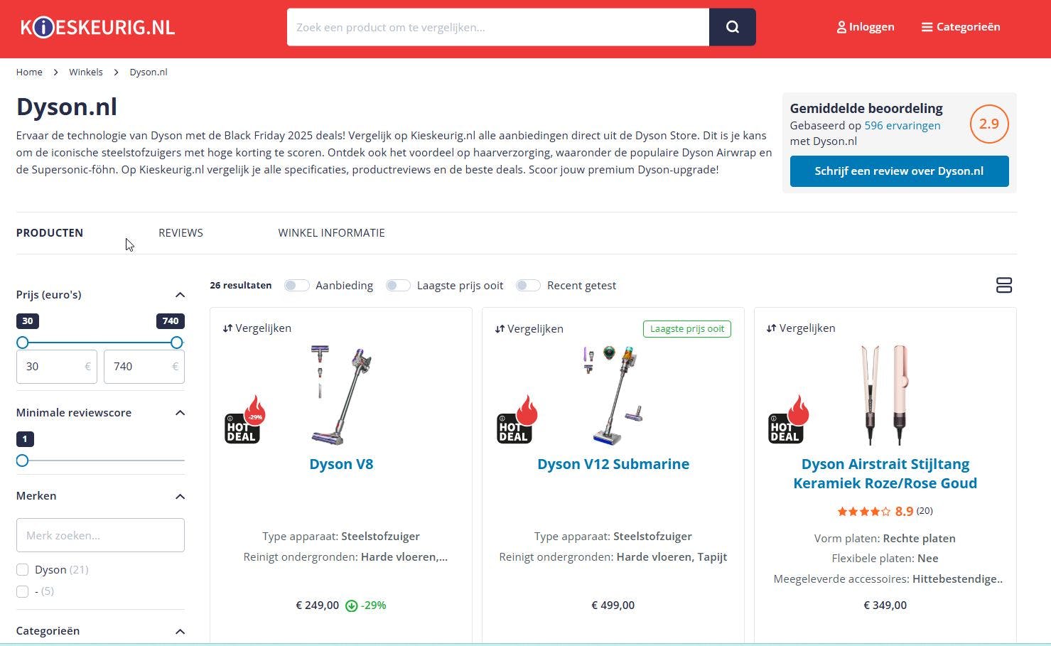 De Dyson shoppagina op Kieskeurig.nl laat het hele aanbod zien, compleet met specificaties, prijzen en reviews. Zo vergelijk je eenvoudig de verschillende Dyson-modellen en zie je in één oogopslag waar de kortingen het grootst zijn.