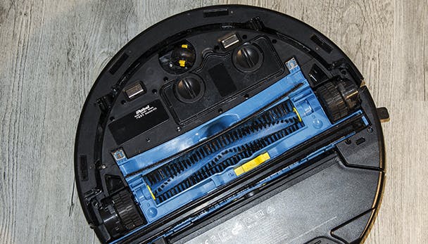 Zodra je de iRobot aan het werk hebt gezet, laat hem dan maar lekker zijn gang gaan. Ga dan ook gerust de kamer uit, want een herrie maakt hij wel. Dat is op zich ook geen wonder: hij draait met zijn borstel, verspreidt het water en rijdt uiteraard ook nog rond. Op de grote ronde knop zijn vakjes weergegeven die aangeven hoe ver hij is. Daarin laat hij met de grootte van de vakjes ook zien in welke van de drie stadia hij is: vegen en inweken, schrobben en opzuigen en als laatste opzuigen en afwerken. Je vloer wordt dus in twee van de drie stappen nat gemaakt en dit zorgt helaas niet voor een geheel streeploze vloer.
