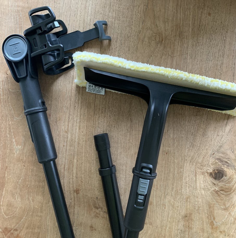 Als aanvulling op de eigen lichaamslengte kan dit met de extensie-set vanaf de grond met ramen tot ongeveer 3 meter hoogte. Daarna wordt de tweede telescoopsteel gebruikt met daaraan de WV6 om in verticale strepen water en vuil van het raam te zuigen. De accu van de WV6 is daarbij groot genoeg om zonder tussentijds opladen meerdere ramen schoon te maken. Net boven het handvat wordt de resterende tijdsduur aangegeven. Omdat je juist geen druk moet zetten bij het opzuigen van het water van het glas, werkt het eigenlijk zeer goed.