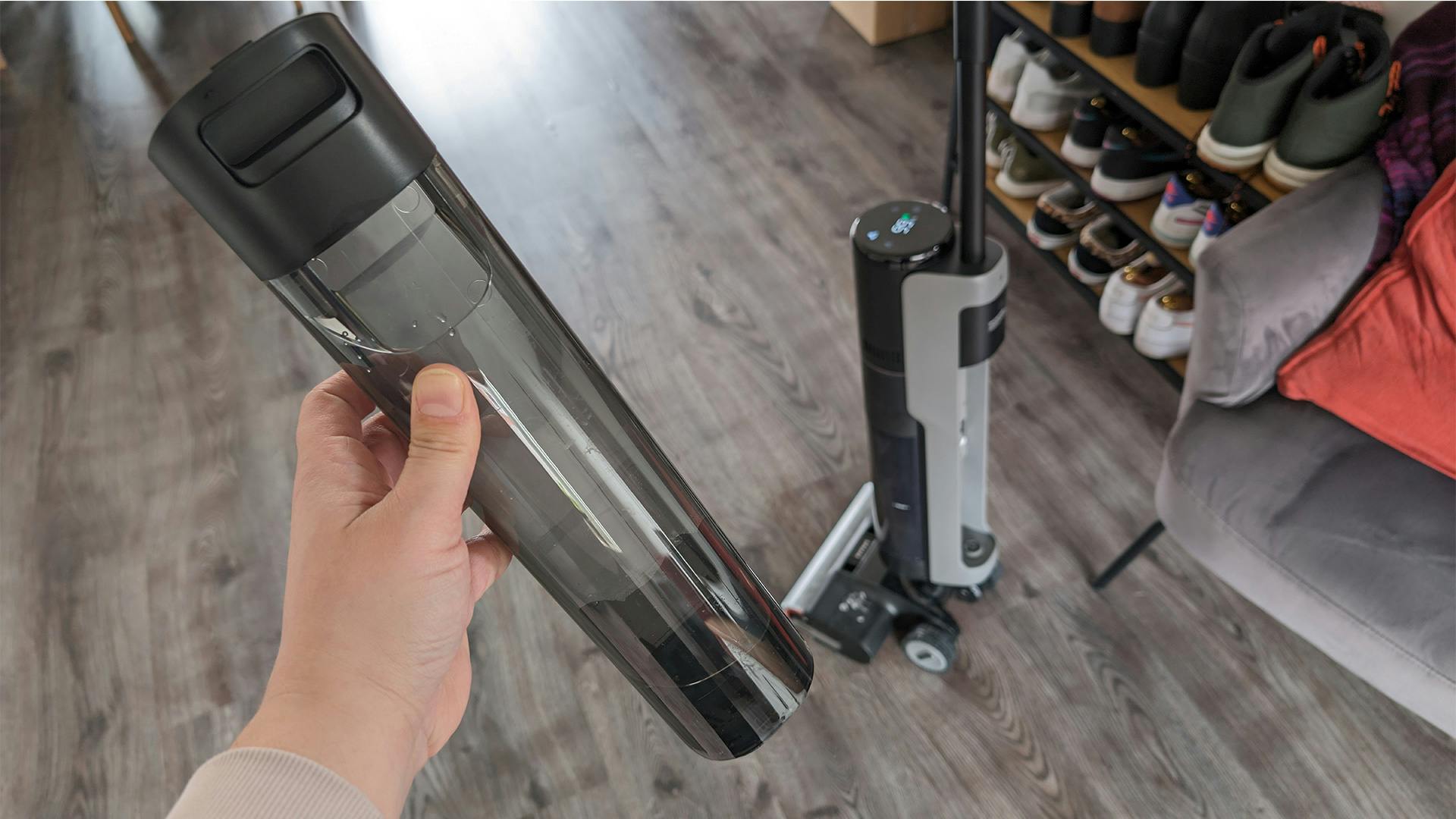 Gelukkig is het wel een goed schoonmaakmiddel. We hebben het dopje gevuld en die in een volle watertank gegooid. Daarmee hebben we een groot deel van het huis hier gestofzuigd en gedweild. De accu was toen voor veertig procent leeg en de watertank was al over de helft. Maar het resultaat mag er zijn. Bepaalde watervlekjes die robotstofzuigers soms laten voor wat ze zijn, verdwijnen eenvoudig. Daarnaast beschikt de Dreame H13 Pro met een zuigkracht van 18.000 Pa over meer dan genoeg kracht om alles op te pakken wat er op de grond ligt.