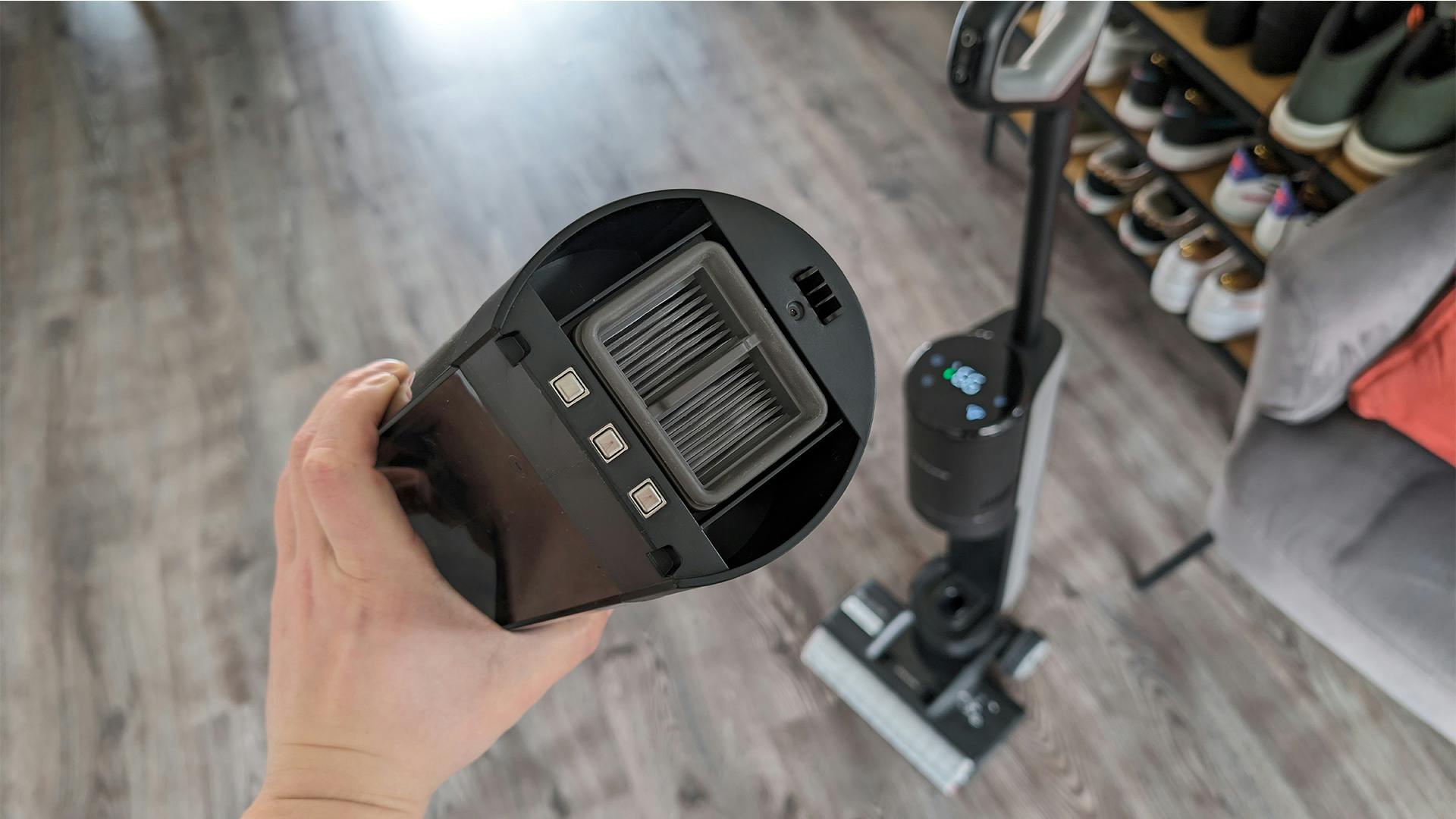 Het gewicht van 5,6 kilo is overigens zonder het water dat je toevoegt. Achterop zit de tank voor schoon water, van 900 milliliter. Het vieze water wordt in een bak van maximaal 700 milliliter opgevangen. Dat is dezelfde bak waar ook het vuil in beland en waar je de HEPA-filter in aantreft. Omdat de Dreame H13 Pro één bak voor stof, viezigheid en het gebruikte water heeft, begrijp je waarom die zo nu en dan aan een schoonmaakbeurt toe is. Dit is een van de weinige nadelen van dit model; wellicht is een aparte opvangbak voor het stof een mooie upgrade voor een toekomstige opvolger.