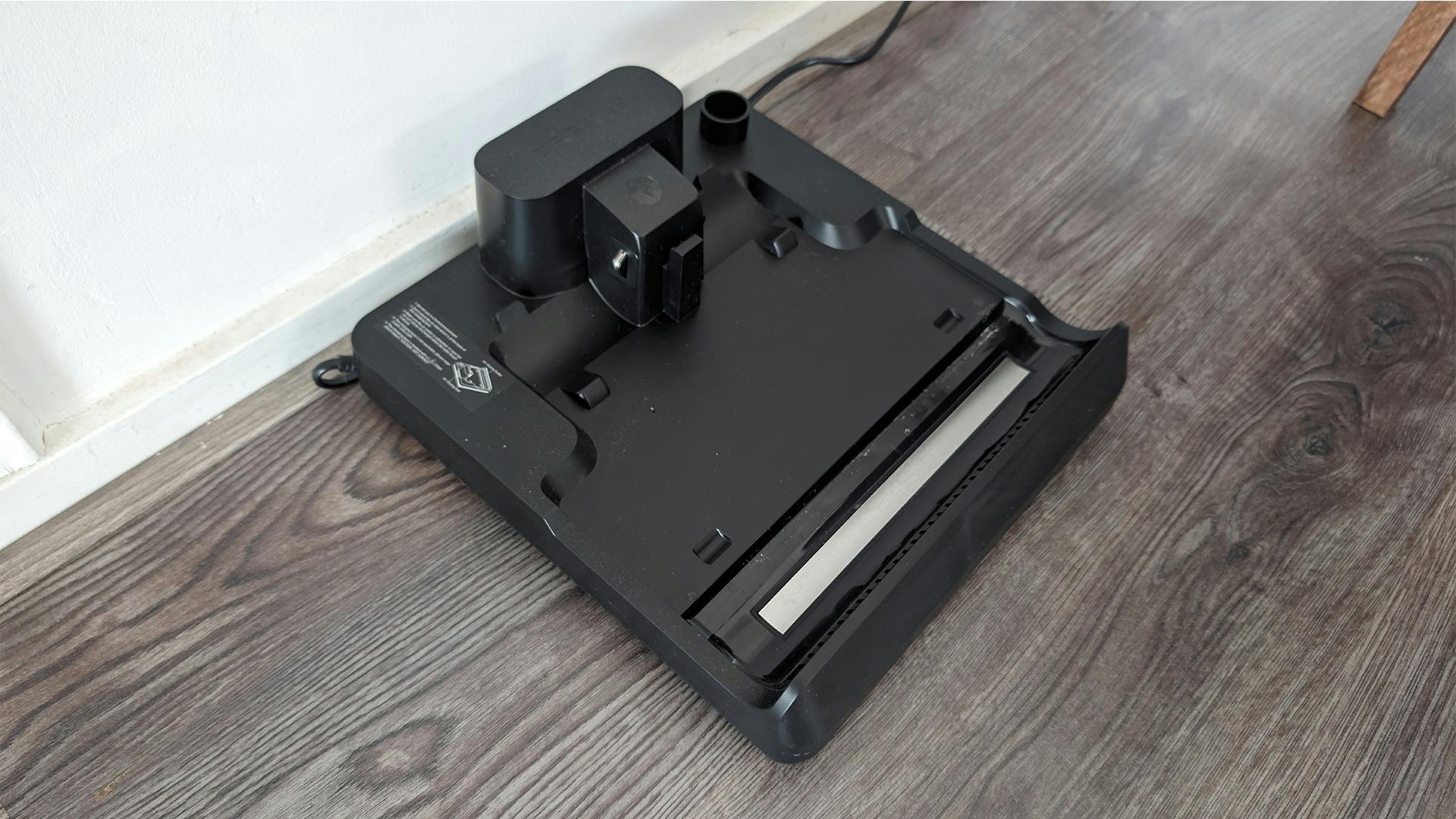 De zuigkracht is zo sterk dat je echt moet opletten wanneer je in de buurt komt van kabels. Zo hebben we hier twee kabels die op de grond liggen. Eén daarvan is van een Philips Hue-vloerlamp, die van z’n vaste positie weggetrokken wordt wanneer de kabel in de zuigmond terechtkomt. Hoewel het systeem slim genoeg is om zichzelf uit te zetten wanneer je de H13 Pro rechtop op de grond plaatst, stopt het niet zodra er dus een kabel gespot wordt. Ook is het zo dat de dweil niet stopt met water afgeven wanneer je over een tapijt of vloerkleed gaat.