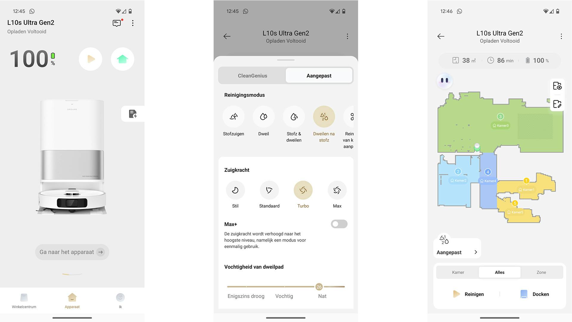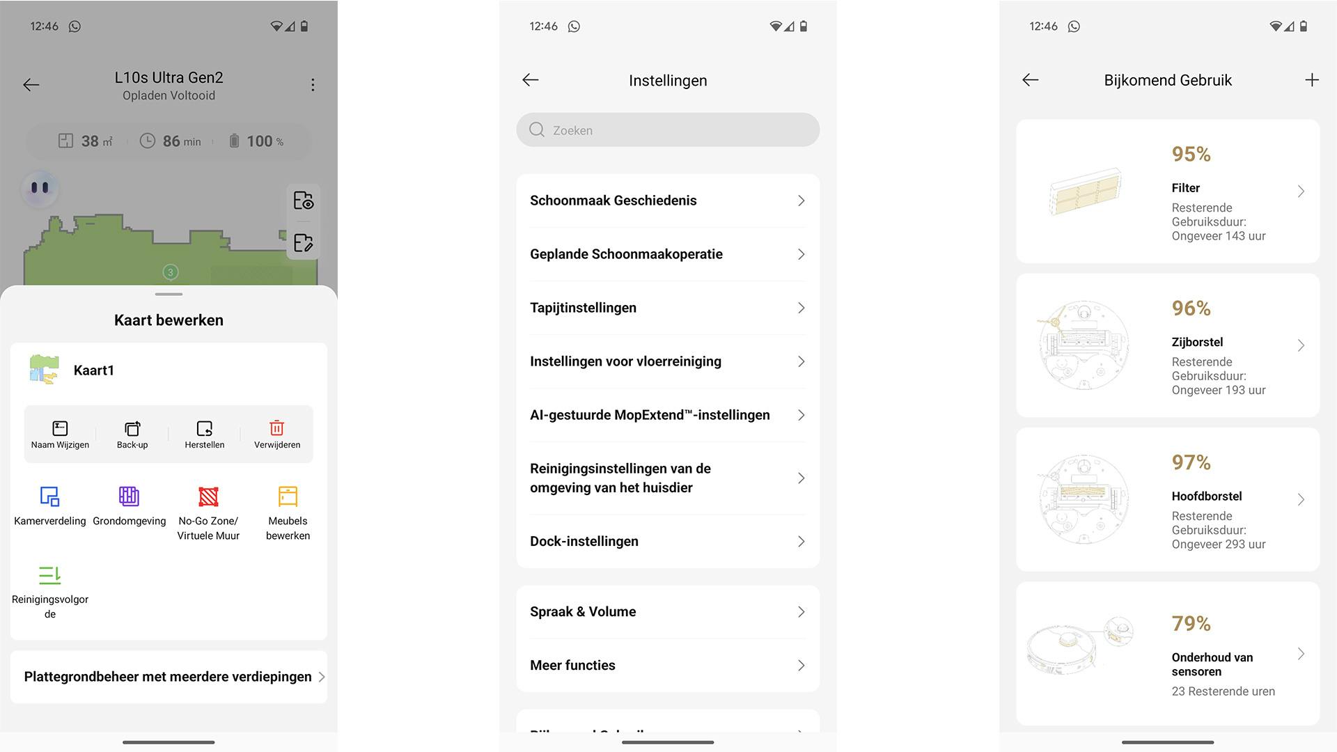 Via de overzichtelijke app kun je heel snel bepalen hoeveel water en zeep de Dreame L10s Ultra (2nd Gen) moet gebruiken. Wellicht helpt het om die hoeveelheid aan te passen, waardoor hardnekkige viezigheid ook zou kunnen verdwijnen – maar meer water en zeep is geen garantie voor succes. Verder bepaal je in de app de zuigkracht, in welke mate de stofzuiger zijn rondes doet (met ruime of minder ruime bochten) en zie je hoe het gesteld is met de verschillende onderdelen. Met die laatste functionaliteit kun je goed zien wanneer iets aan vervanging toe is of wanneer je ergens een lapje over moet halen.