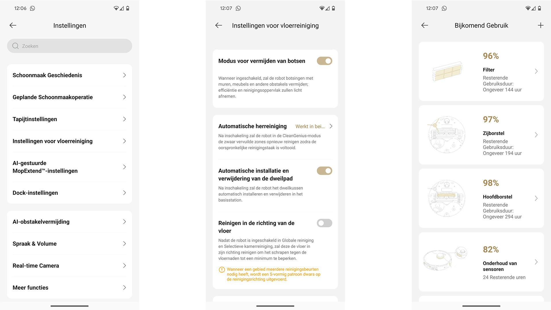 Daar waar de Roomba Combo j9+ nog wel eens aangeeft dat er een probleem is met een specifiek onderdeel, waardoor die soms iets niet wil doen, doet de Dreame dat helemaal niet. Als er dus iets klem zit, dan moet je daar zelf op de een of andere manier achter zien te komen. Binnen de app treffen we wel een onderhoudsstatus aan per onderdeel, zoals de borstel, de dweil en meer. Maar daaruit kun je niet opmaken dat er dus iets aan de hand is. Daarmee kun je alleen zien wanneer je iets handmatig moet schoonmaken, of misschien moet vervangen.