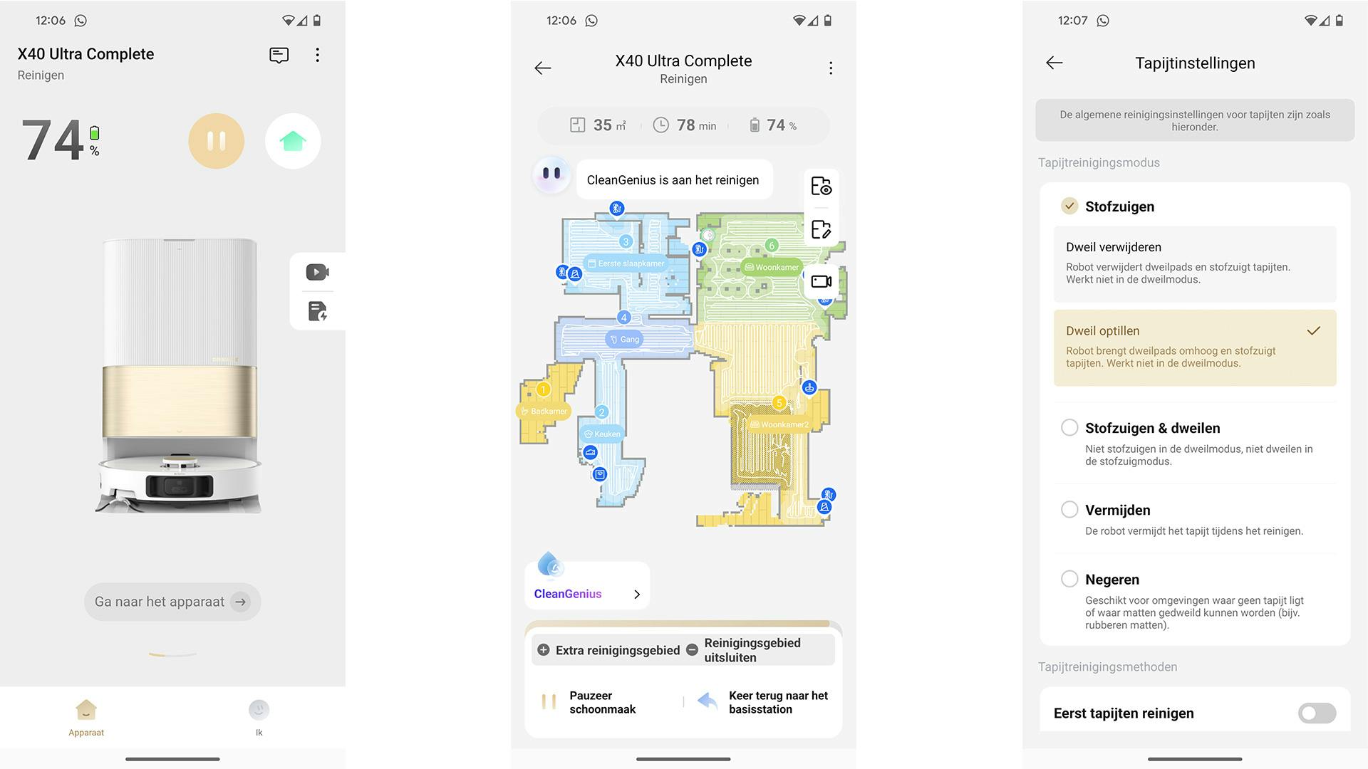 Het systeem is daarnaast in staat tapijten en vloerkleden automatisch te herkennen. Maar als je wilt, kun je binnen de app een gebied aangeven waar de Dreame X40 Ultra Complete niet mag dweilen. Dan trekt de stofzuiger de pads zo’n 10,5 millimeter omhoog, waarmee hij voorkomt dat kleden nat worden. Uit onze ervaring, met een hoogpolig tapijt, blijkt dat ook zo te zijn. Zelfs de randen zijn niet stiekempjes toch wat nat, wat nog wel eens bij concurrerende of eerder uitgebrachte modellen gebeurt. Mocht er toch iets zijn, dan kun je via de app het gedrag verder beïnvloeden.