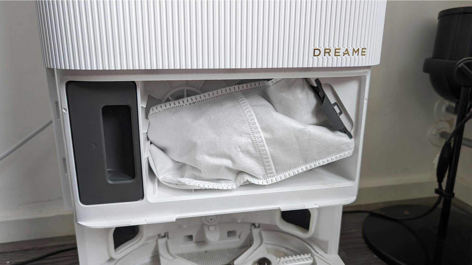 Aangezien dit een robotstofzuiger met dweilfunctie is, kun je een flinke oplaadbasis verwachten. In dit basis zitten niet twee, maar dit keer drie bakken. Eén van het schone en één voor het vieze water, en tot slot een houder voor het schoonmaakmiddel. Bij de L10s Ultra is het zo dat je aparte capsules moet kopen die je in de houder klikt. Maar daardoor kun je gemakkelijker een eigen oplossing, of het middel van Dreame gebruiken. Uiteraard raadt de fabrikant zijn eigen schoonmaakmiddel aan, waarmee je “het risico op corrosie en schade beperkt”.