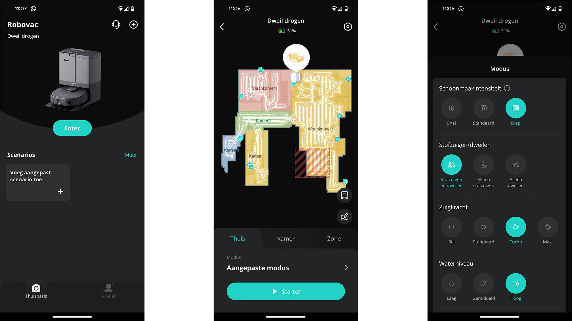 Binnen de app is het tevens mogelijk zones aan te maken waar de Eufy X10 Pro Omni niet mag komen of alleen niet mag dweilen. Zo voorkom je dat hij op plekken komt waar bijvoorbeeld veel speelgoed of draden liggen, of dat het tapijt nat wordt. De dweilpads gaan dan vanzelf omhoog wanneer hij bij het kleed arriveert. De app is verder overzichtelijk en gemakkelijk in gebruik. En als je eenmaal de juiste instellingen voor jezelf hebt gevonden, slaat Eufy die automatisch op. De volgende keer dat je de Eufy X10 Pro Omni dan wilt gebruiken, druk je gewoon op de knop Starten.