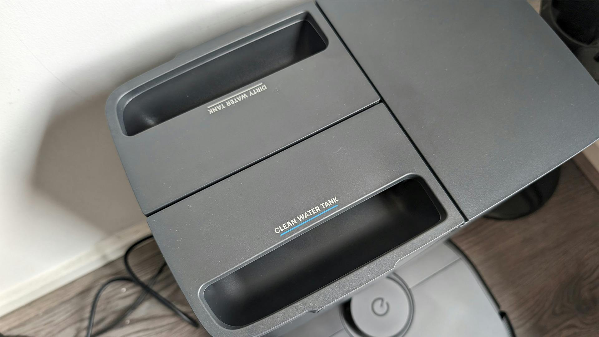 Net als bij de Philips zien we dat het basisstation wat compacter is dan bij duurdere modellen. En dat terwijl er toch echt twee bakken met water op zitten: een voor het schone en een voor het vieze water.