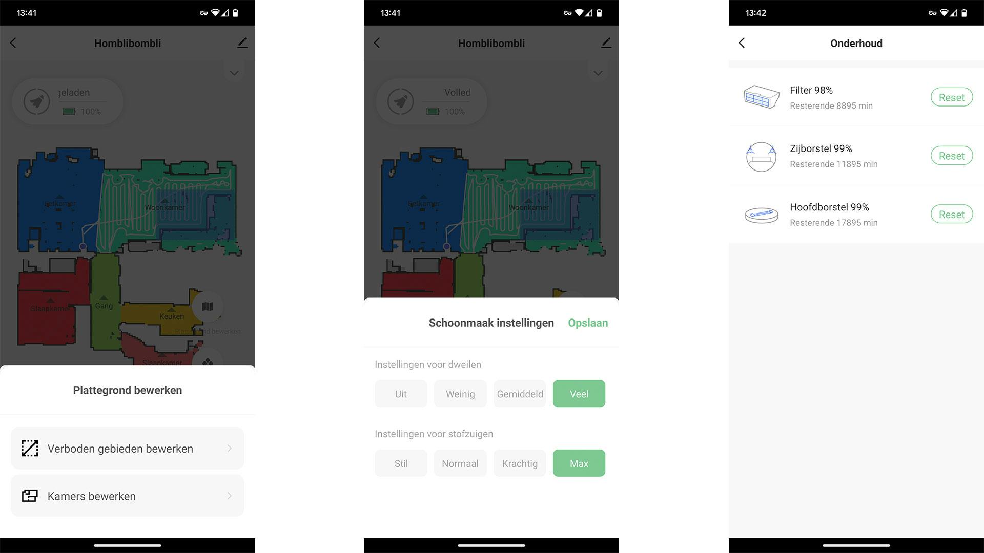 Daar ligt dan ook de krachtigste eigenschap van de Smart Robot Vacuum. De app is namelijk zeer overzichtelijk, uitgebreid en toegankelijk. Je kunt met een enkele tik op het scherm de vochtigheid van de dweilfunctie en de zuigkracht aanpassen. Ook controleer je hoe het zit met alle filters (en zie je of ze aan vervanging toe zijn) en pas je de huiskaart aan. Je stuurt hem naar specifieke kamers of plekken of start meteen de algemene schoonmaaktaak. Hombli heeft het gebruik van de slimme robotstofzuiger enorm toegankelijk gemaakt.