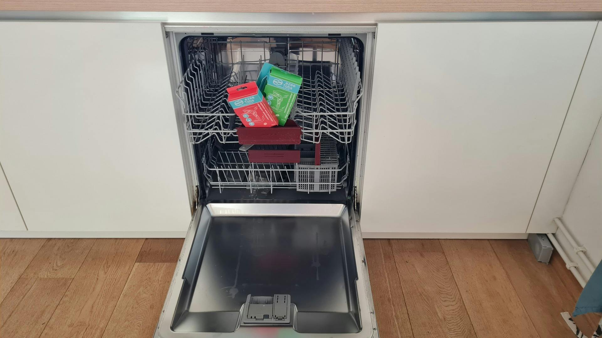 De vaatwasserontvetter, -ontkalker en de wasmachinereiniger zijn grote tabletten. Je plaatst de vaatwastabletten onder in de vaatwasser en start een programma. Op de verpakking staat dat je een warm programma moet gebruiken, maar op de website lees ik dat een volledig reinigingsprogramma van 60 graden vereist is. Na het programma met de ontvetter is de vaatwasser schoon en klaar voor gebruik. Het ruikt fris en ziet er goed uit. Ook het vet bij de rubbers is nu eenvoudig te verwijderen. En de ontkalker werkt ook goed; er is geen kalk meer in de vaatwasser te zien.