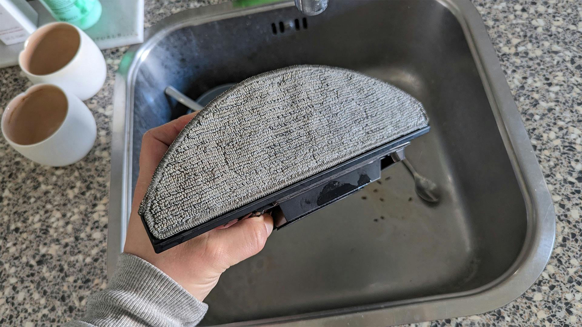 Die Bin heeft in feite twee bakken: een kleine bak voor het stof en de viezigheid en een aparte waterbak. Dat werkt net als op bijvoorbeeld de Roomba Combo j7+, Hombli Smart Robot Vacuum of de Eufy Robovac X8 Hybrid. Met wat priegelwerk schuif je de dweil er aan de onderkant op. Vervolgens vul je de bak met wat water en zeep (in tegenstelling tot de Hombli mag je hier wel gewoon zeep gebruiken) en klik je hem in de Roomba Combo i8+. Dan denk je: de robotstofzuiger herkent natuurlijk meteen dat er nu een nieuwe bak in zit, maar helaas – niets is minder waar.