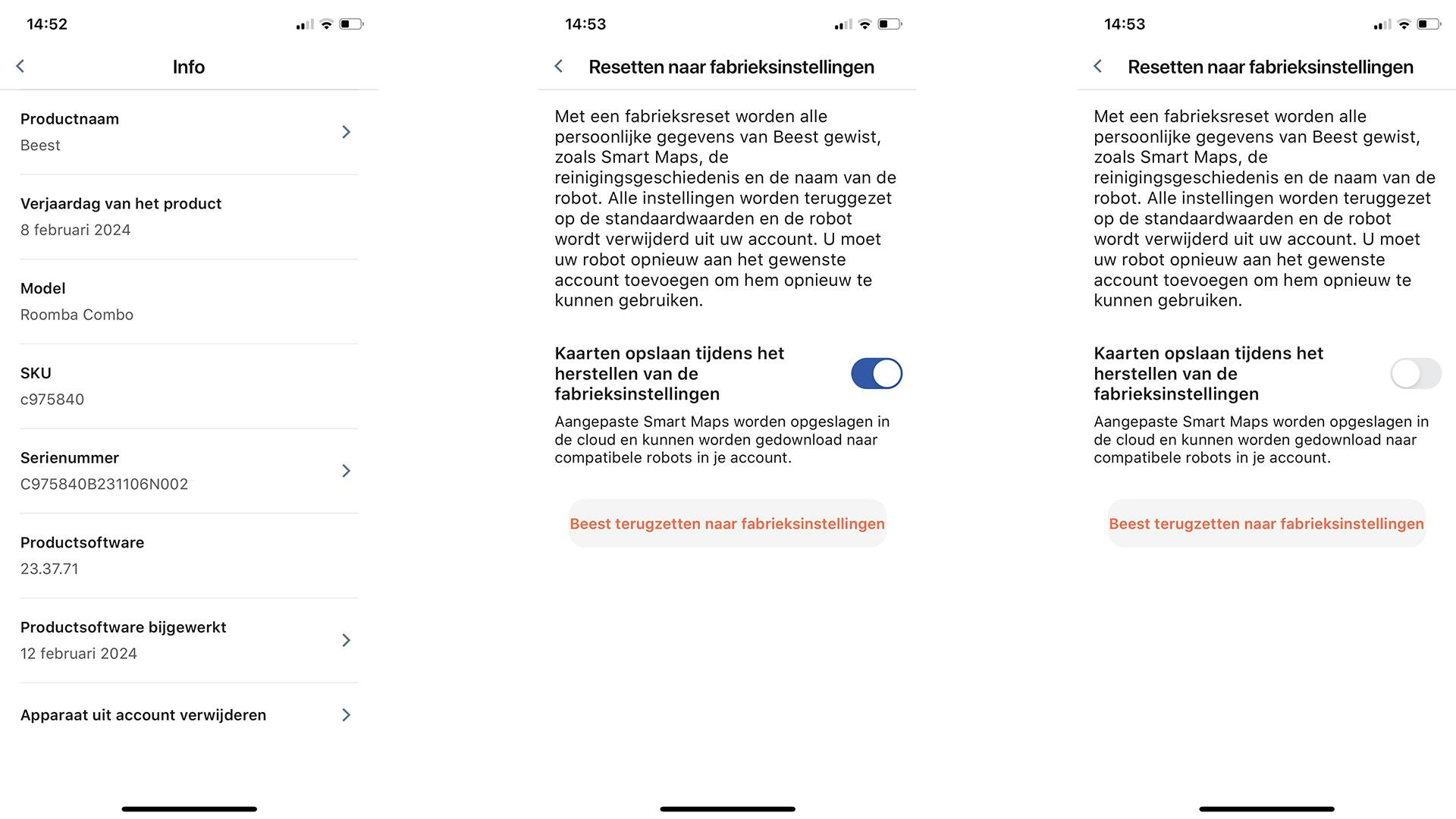 ⇨ Bevestig je keuze op het volgende scherm door op [naam Roomba] terugzetten naar fabrieksinstellingen te tikken.