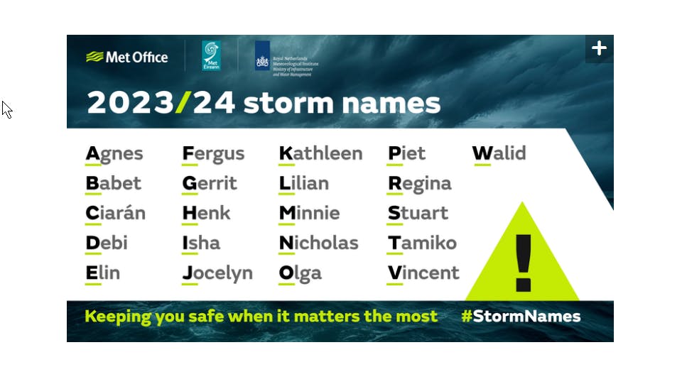 In Nederland wordt er eigenlijk alleen een naam gegeven aan stormen waarvoor code oranje of code rood wordt uitgegeven. In een enkel geval krijgt een storm ook al bij code geel een eigen naam. Dat gebeurt bijvoorbeeld wanneer de kans groot is dat er opgeschaald moet worden naar code oranje, of omdat de storm in het Verenigd Koninkrijk is ontstaan en daar al een naam heeft gekregen. De namen voor dit jaar vindt je op de lijst Stormnamen 2023-2024. Deze lijst wordt samengesteld door Nederland, Groot-Brittannië en Ierland. Zeven van deze namen zijn aangedragen door bezoekers van de open dag van het KNMI: Babet, Elin, Gerrit, Henk, Olga, Piet en Walid. Waarbij Gerrit verijst naar Gerrit Hiemstra, de weerman die na bijna 25 jaar afscheid nam bij de NOS. STorm Piet is een eerbetoon aan Piet Paulusma, die vorig jaar overleed.