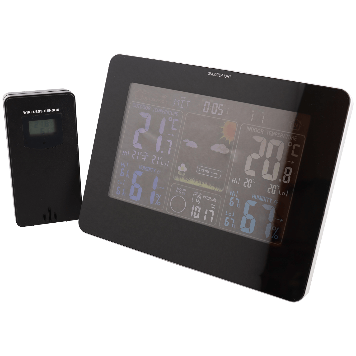 De buitenunit bevat verschillende sensors waarmee dit apparaatje diverse meetgegevens draadloos aan de binnenunit doorgeeft. Dat gebeurt via een 433MHz-radioverbinding. Voorkom interferentie van nabijgelegen apparaten die op dezelfde radiofrequentie uitzenden; dat leidt namelijk mogelijk tot storingen. Onder het verlichte lcd-scherm bevinden zich vijf drukknoppen; hiermee zet je bijvoorbeeld een wekker of verander je de datum en tijd. Wil je het alarm nog even uitstellen? Druk dan op de onderste sluimerknop.