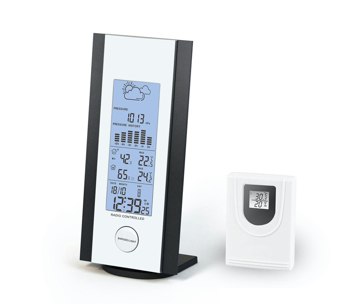 Ondanks het bescheiden prijskaartje geeft de Cresta Care DTX250S een volledig weerbeeld. Het blauwverlichte verticale display van de binnenunit toont namelijk nogal wat gegevens. De tijdsaanduiding onderaan is radiogestuurd, zodat het weerstation vanzelf schakelt tussen zomer- en wintertijd. Verder laat het scherm de temperatuur en luchtvochtigheid van zowel de binnenruimte als buiten zien. De barometer van de buitenunit meet de luchtdruk. Op basis van deze ontvangen luchtdrukgegevens verschijnt er bovenaan een weersvoorspelling voor de komende 12 of 24 uur middels vier verschillende symbolen.