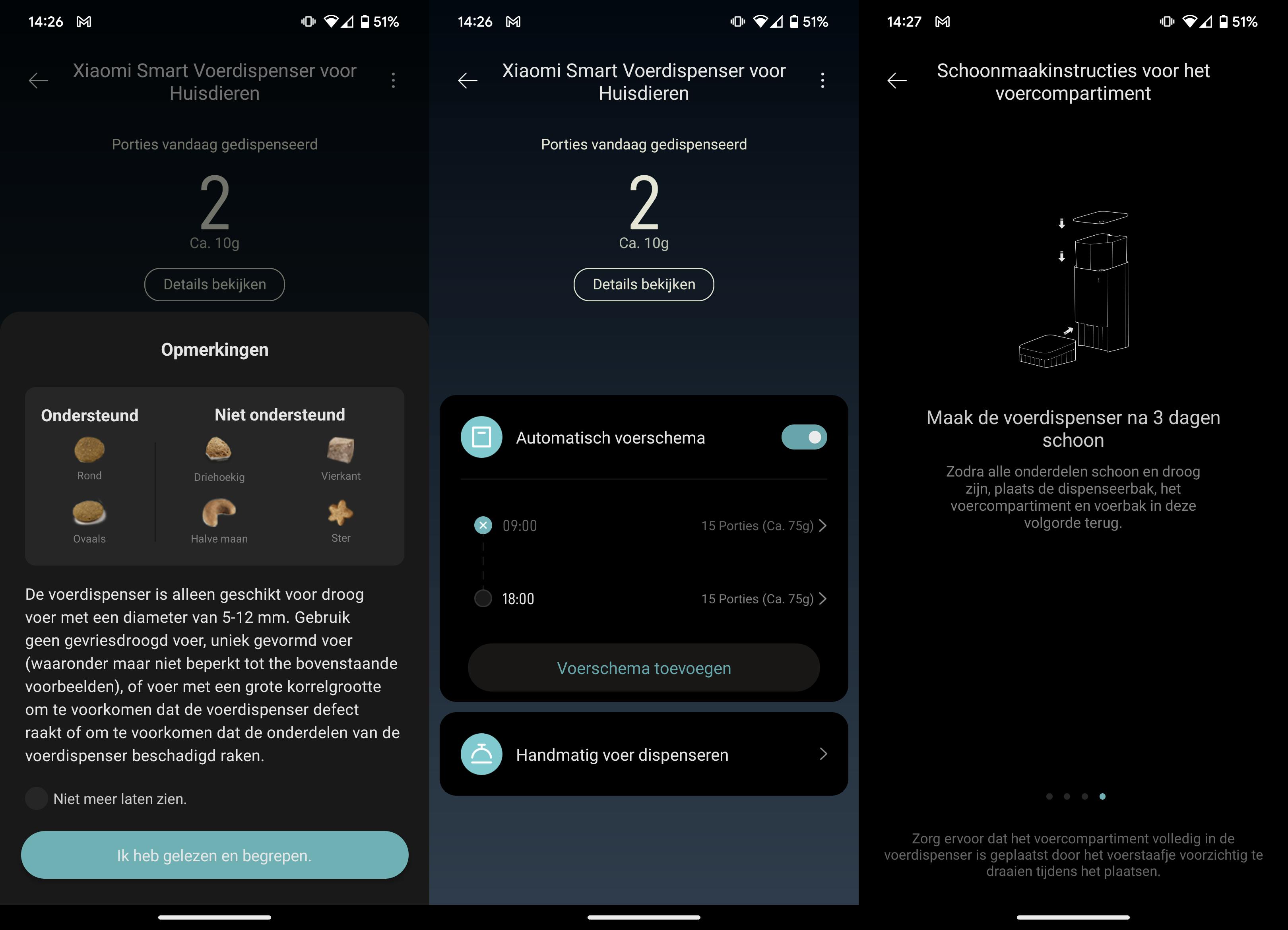 Gaat er iets niet goed met dispenseren? Dan krijg je uiteraard ook een melding, bijvoorbeeld als er niet genoeg brokjes meer zijn of er een blokkade optreedt. Om dat laatste te voorkomen moet je zorgen dat de brokjes het juiste formaat hebben. De app legt precies uit wat voor soort brokjes wel of niet in de slimme voerdispenser kunnen.