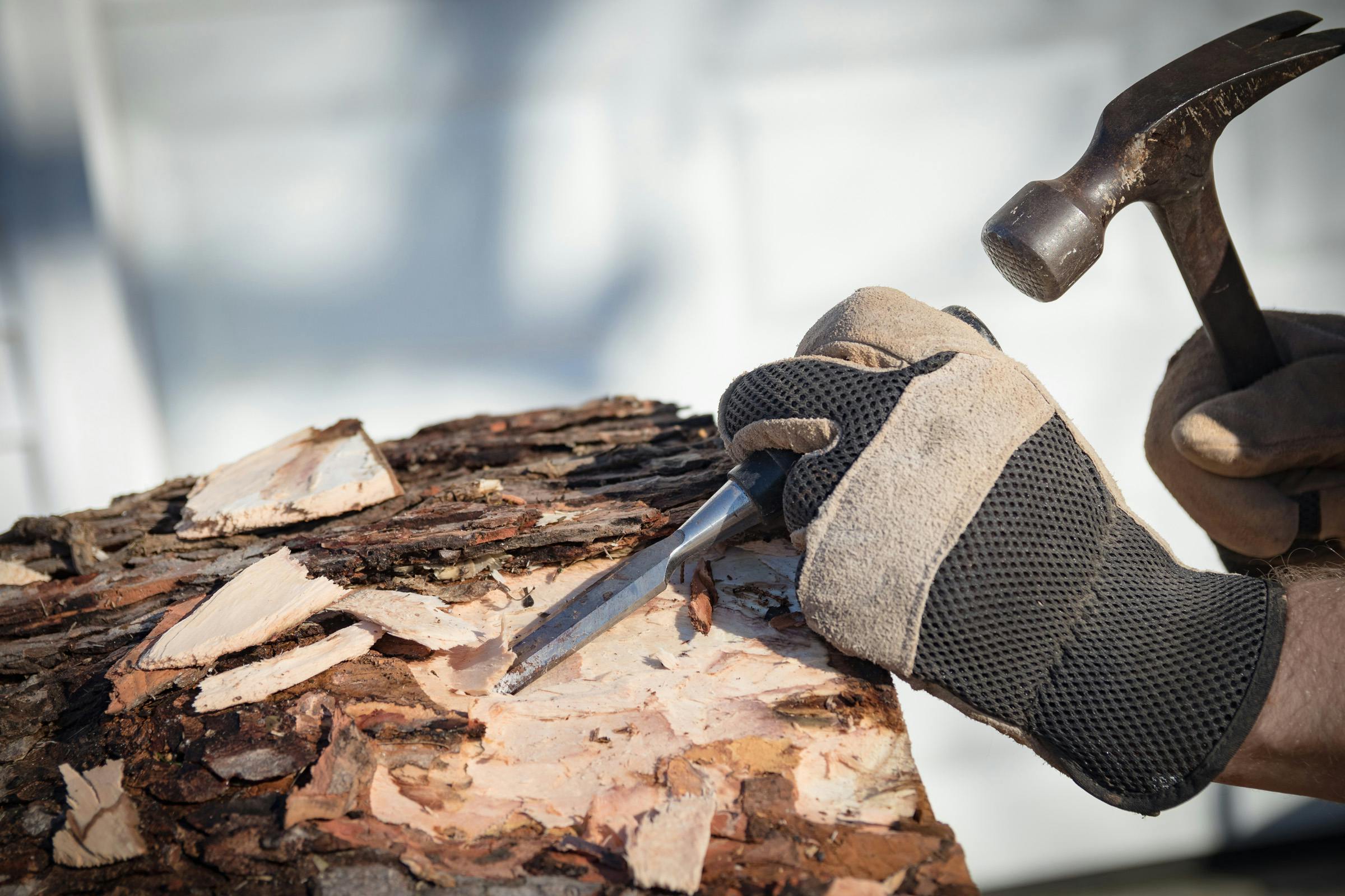 Voor een extra lange levensduur verwijderen we de schors. Vind je de schors juist het mooiste gedeelte? Dan kun je die laten zitten, maar bedenk wel dat je bijzettafel dan sneller aan vervanging toe is. Het is lastig te zeggen hoe lang je ervan geniet, maar zelfs met schors gaat een tafeltje meerdere jaren mee. Besluit je om de schors te verwijderen? Ga dan voorzichtig met een hamer en beitel aan de slag tot de hele stam kaal is.
