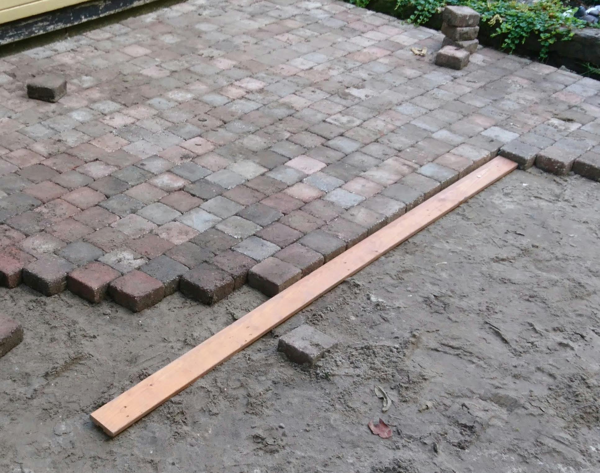 Blijf daarnaast ook altijd in dezelfde richting straten, bijvoorbeeld van links naar rechts. Ga niet eerst een lange rij tegels of stenen in de lengte legen en vanuit daar weer in de breedte, want iedere millimeter die je in de lengte (ongemerkt) uitloopt, zorgt ervoor dat de andere rijen niet meer goed passen.