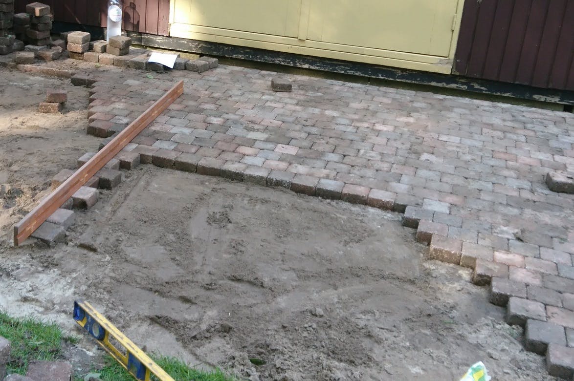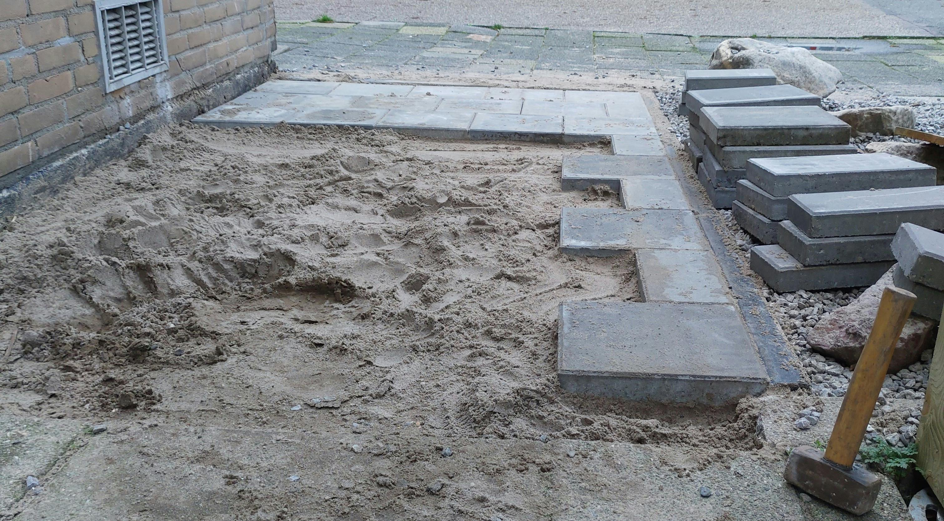 En hoewel dat misschien niet altijd even natuurlijk voelt, werk je ook het liefst van je af. Je zit dus op je knieën op (het eerste deel van) de bestrating en werkt naar buiten toe, van je af. Zo voorkom je dat je het zandbed telkens verstoort en je - door teveel druk van je voeten of knieën op dat zandbed - steeds zand moet aanvullen.